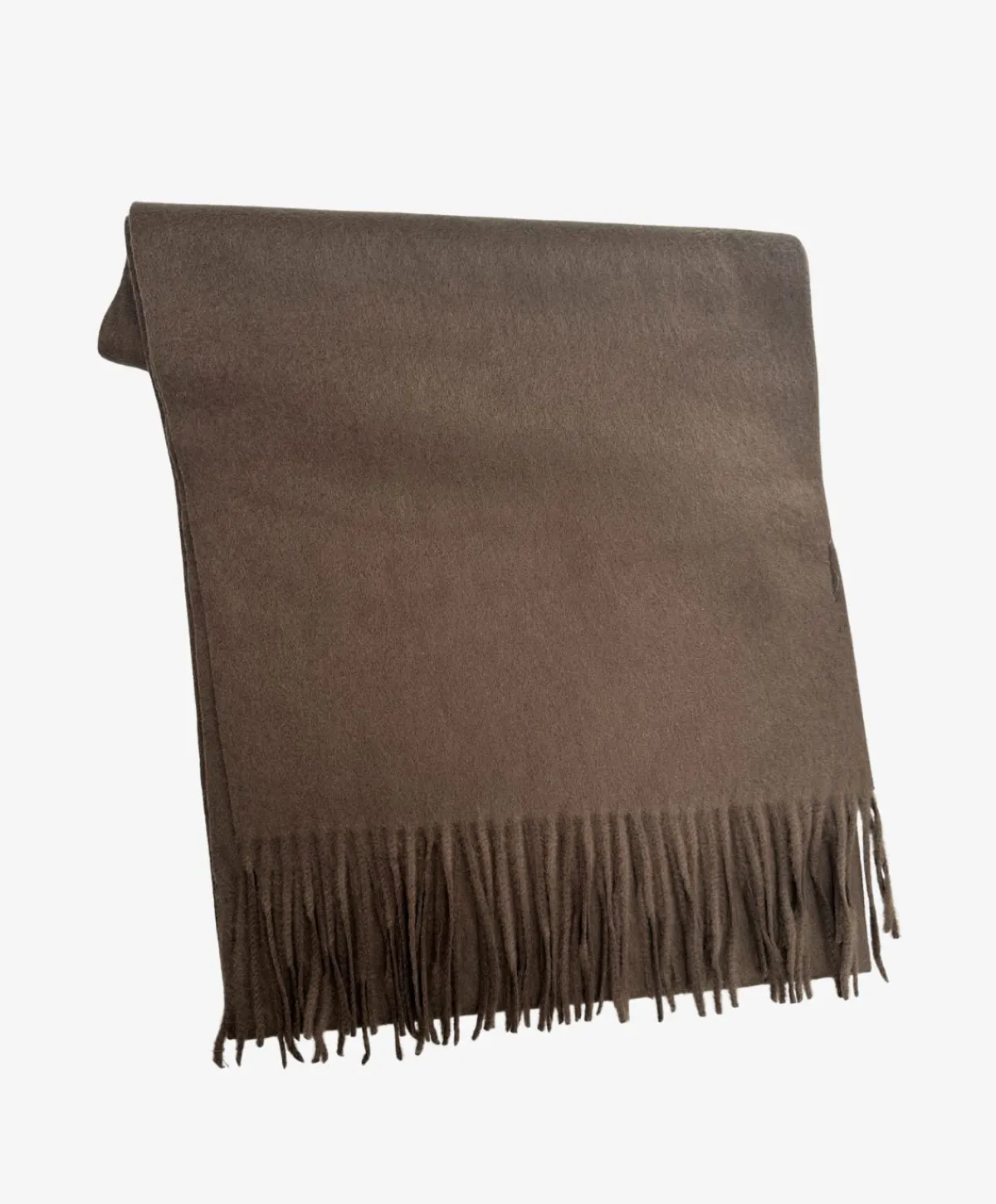 Giv din efterårs- og vintergarderobe et varmt og stilrent løft med dette elegante halstørklæde i mørkebrun. Materialet føles blødt og behageligt mod huden, og farven gør halstørklædet ideelt til dig, der elsker neutrale, klassiske toner. De fine frynser langs kanten fremhæver det feminine udtryk og gør det nemt at style både til frakker, strik og overgangsjakker.