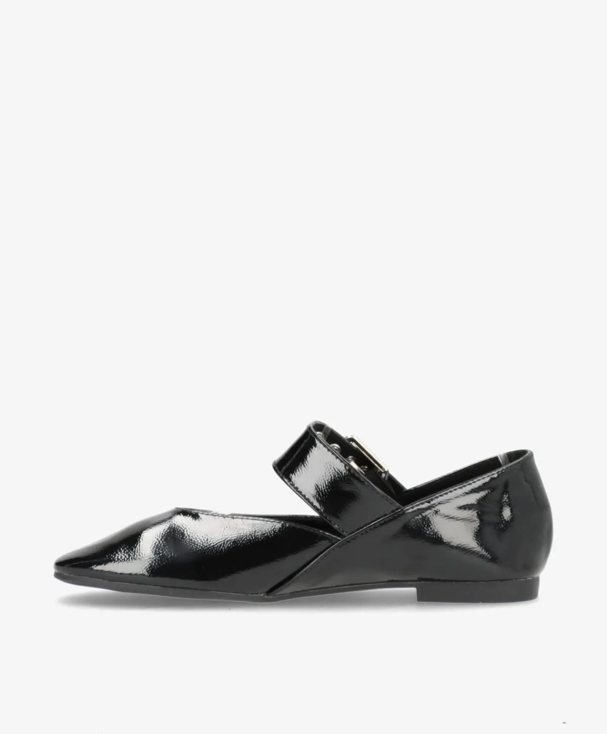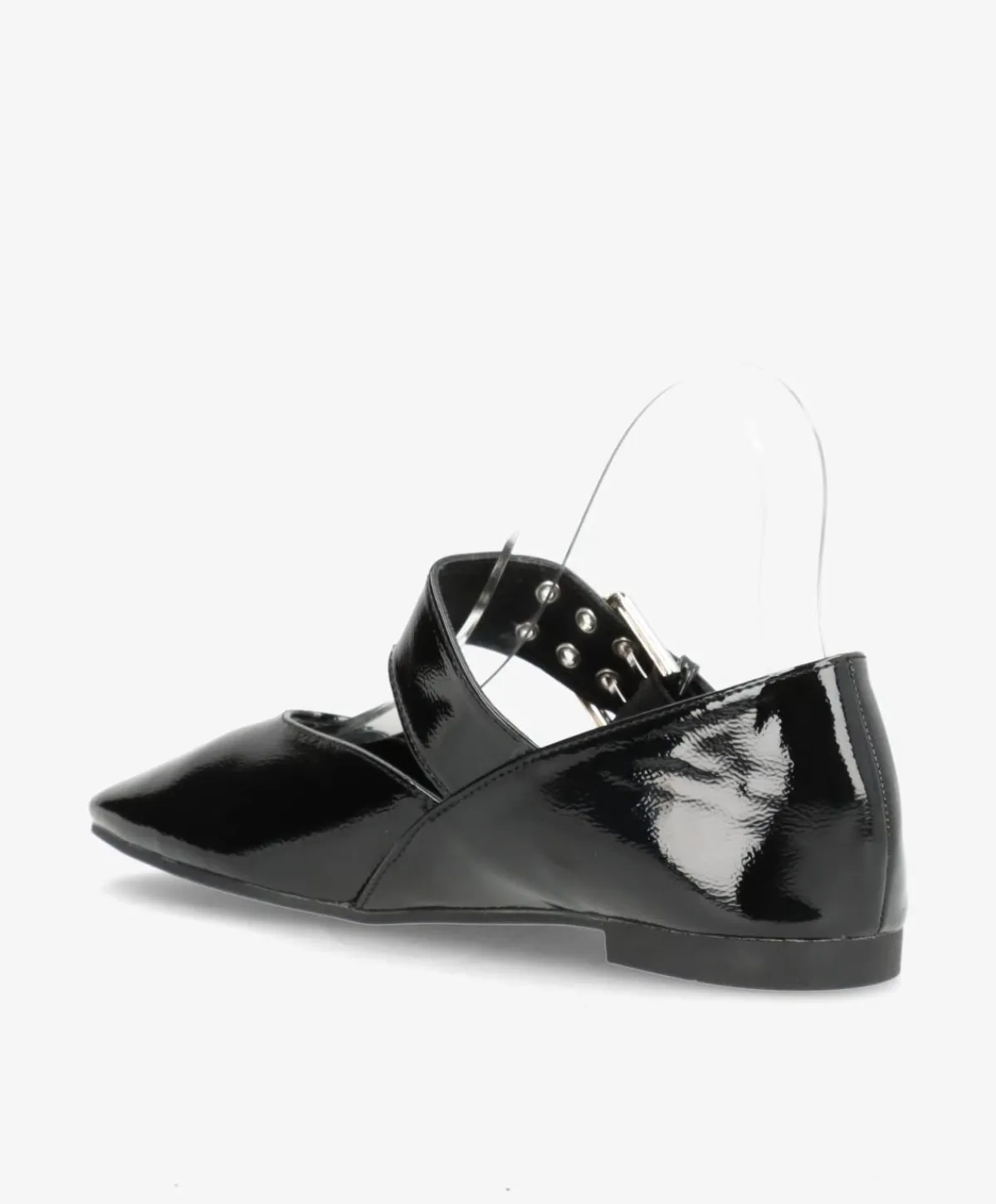 FOIX ballerinaen er en stilsikker og moderne sko med masser af attitude. Det skinnende lakfinish giver et edgy look, mens den brede rem med dekorative spænder tilfører både kant og elegance. Den spidse snude forlænger benene visuelt og giver et flatterende udtryk – perfekt til både jeans og kjoler.