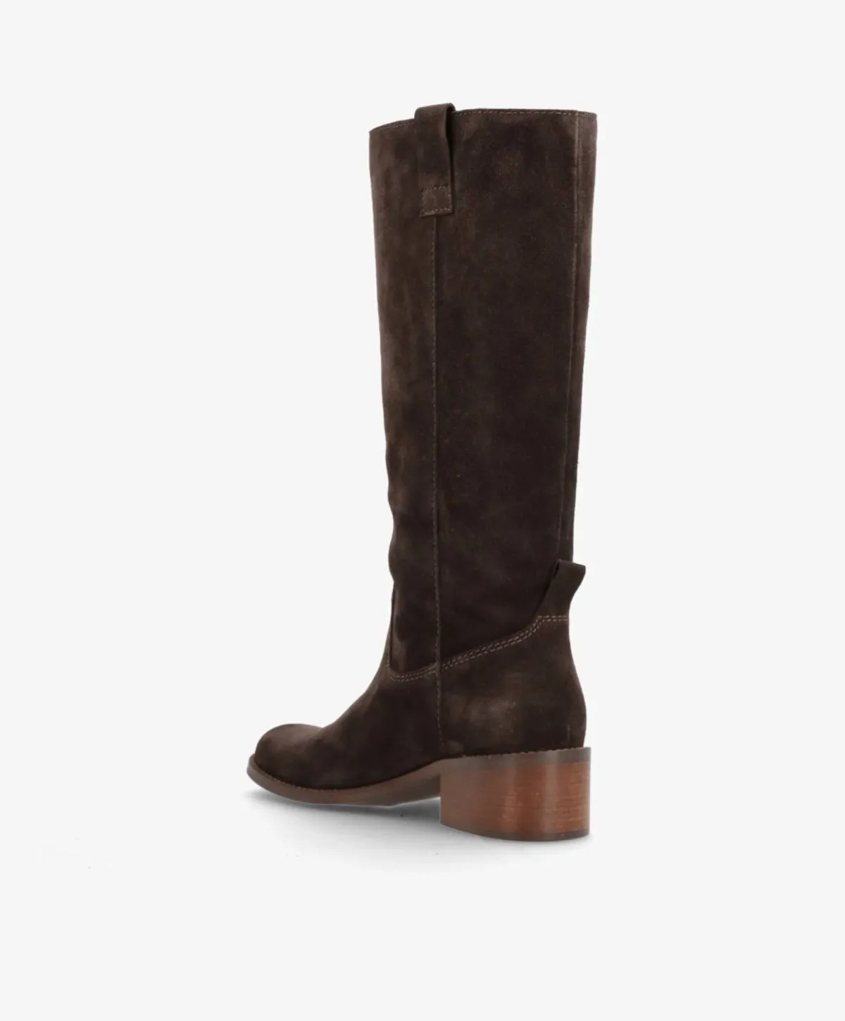 MARTINA er den perfekte langskaftede støvle til dig, der elsker enkelhed med karakter. Det bløde, mørkebrune ruskind kombineret med det klassiske western-inspirerede skaft giver et sofistikeret og naturligt look, som passer perfekt til både hverdagsjeans og strikkjoler. Den stabile hæl og let rundede snude gør støvlen komfortabel hele dagen – uden at gå på kompromis med stilen.