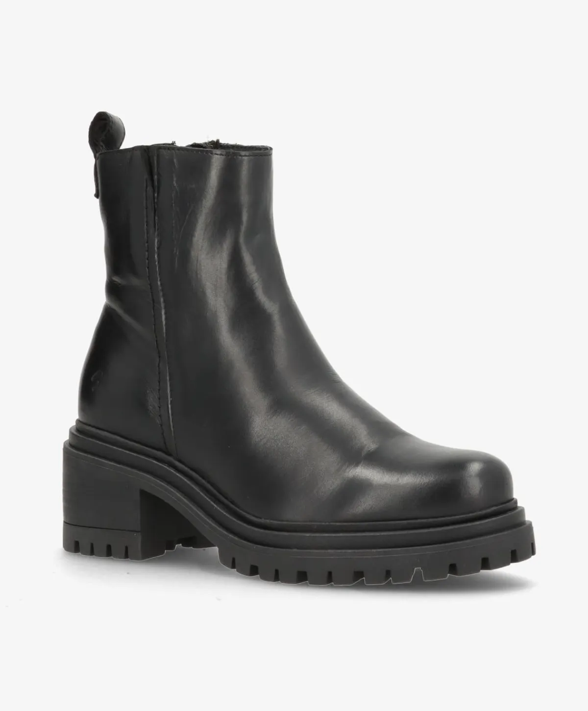Denne sorte støvle er lavet i blødt, glansfuldt læder, som former sig flot om foden og giver et stilrent udtryk. Den mellem-høje skaft og den solide hæl giver god støtte, mens den grove sål sikrer stabilitet og greb – perfekt til efterår og vinter. Lynlåsen i siden gør støvlen nem at tage af og på.
