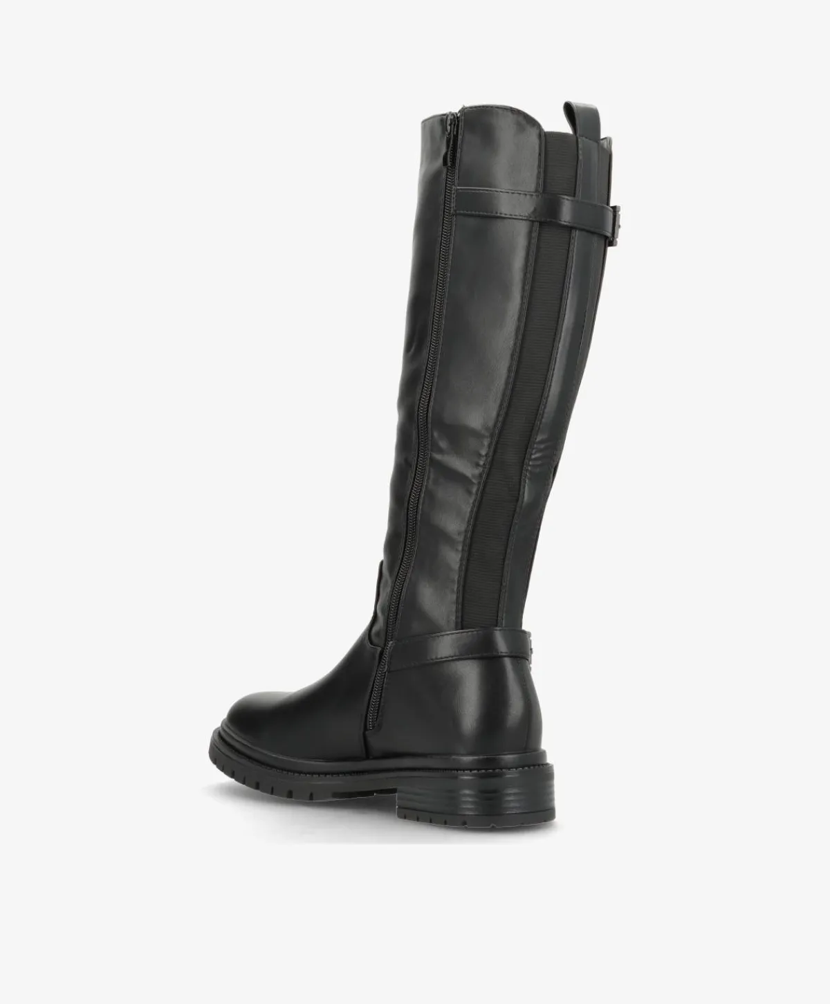 ENYA fra Havanna Shoes er en stilren knæhøj støvle med et moderne og funktionelt udtryk. Fremstillet i sort imiteret læder, kombinerer den en klassisk silhuet med praktiske detaljer som elastik i skaftet og spænder både foroven og ved anklen.