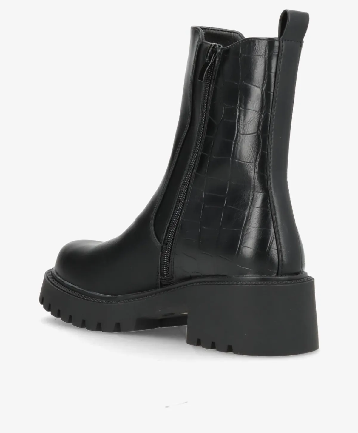 Smuk og stilren sort støvle i imiteret skind, der kombinerer enkelt design med trendy detaljer. Støvlen har en blød elastik i siden, der giver en fleksibel pasform, samt en solid gummisål, som sikrer komfort og stabilitet i hverdagen. Den blanke overflade i kombination med den let markerede struktur bagtil giver et elegant og moderne udtryk.