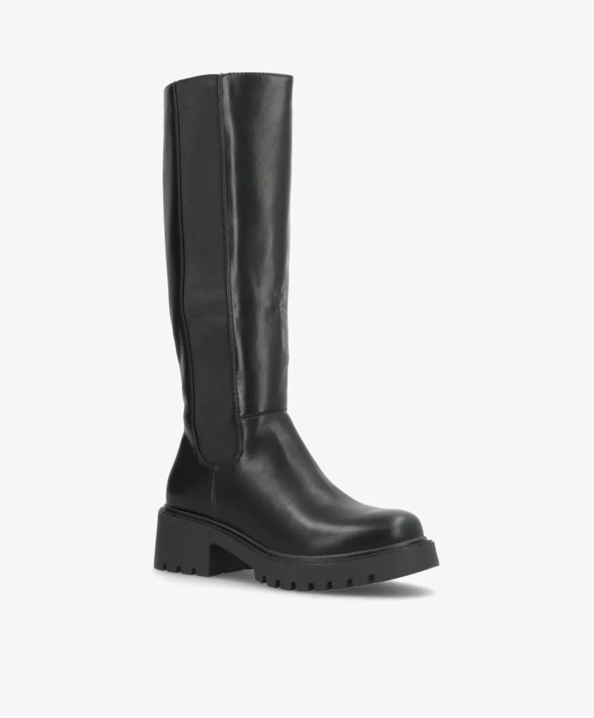 Elegant og klassisk lang støvle i sort imiteret skind, der kombinerer komfort og stil. Den høje silhuet giver et sofistikeret udtryk, mens den elastiske sidepanel og praktiske lynlås gør det nemt at få støvlen af og på. Den kraftige gummisål sikrer et stabilt fodfæste, perfekt til både byliv og hverdagsbrug.