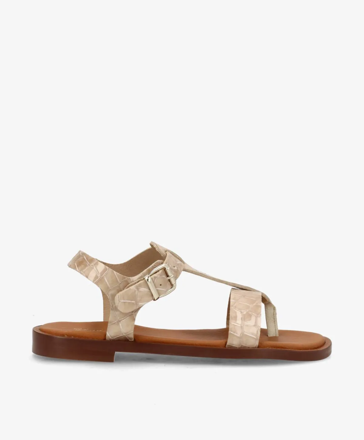 Den smukkeste Shoedesign Copenhagen sandal i et beige, præget skind. De flotte sandaler har et cool croco præg, som giver et råt touch til det stilrene design. De har en tåstrop foran, en rem der løber over foden samt en justerbar ankelrem, så de sidder super godt til på foden. Derudover kan de nemt tilpasses efter behov med den justerbare rem. Sandalerne er perfekte til hende med den klassiske stil, og kan nemt styles på et væld af måder.